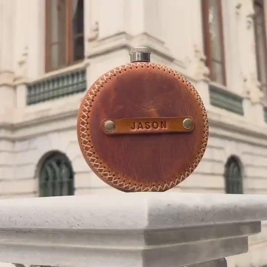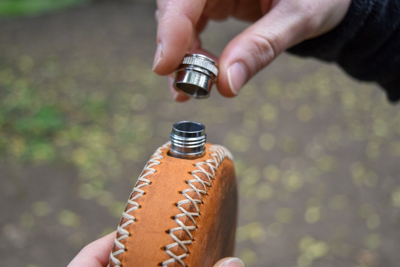 Bring a touch of sophistication to your outdoor adventures with our personalized leather hip flask. Perfect for groomsmen. This sleek and stylish flask fits easily into your pocket and is designed to keep your favorite beverage safe and secure. Crafted from high-quality materials, this flask features a durable leather cover and a tight-fitting screw cap to ensure no leaks or spills. Whether you're on a hike, camping, mountain activities or just want to enjoy a drinvk on the go, this flask is the ultimate accessory for any whiskey, cognac brandy connoisseur.